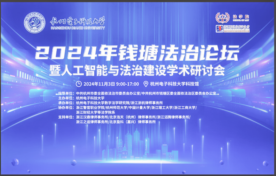 11月3日,“2024年钱塘法治论坛暨人工智能与法治建设学术研讨会”在杭州电子科技大学举行。本次论坛由中共杭州市委全面依法治市委员会办公室和中共杭州市钱塘区委全面依法治区委员会办公室指导,杭州电子科技大学数字法学研究院和浙江浙杭律师事务所承办。