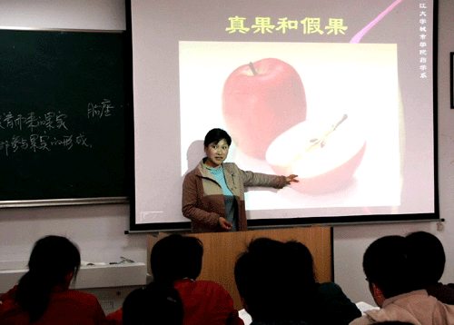 真假苹果你能鉴别吗?城市学院教师基本功比赛近日拉开帷幕,参赛教师纷纷上讲台施展才华,给同学讲授自己最拿手的课程。图为生命科学学院参赛教师讲授《药用植物学》。(摄影:陈昊)